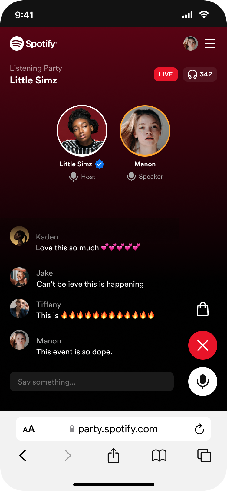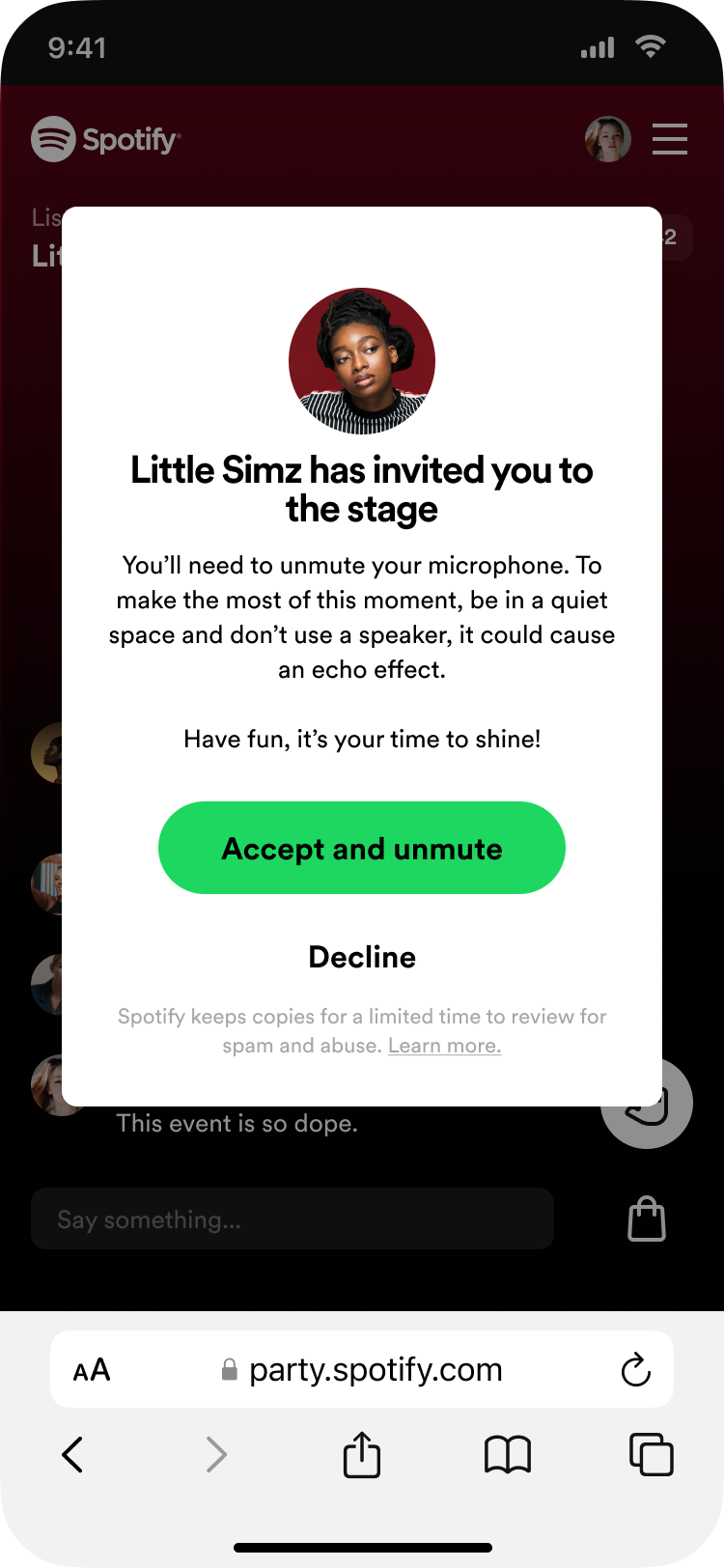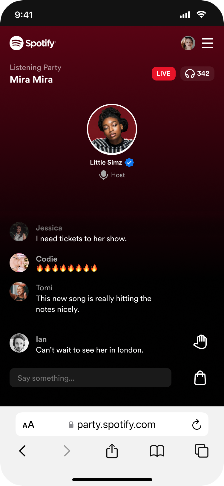 Spotify Listening Parties are exclusive, invite-only digital live audio experiences where top fans connect with their favorite artists. Within these parties, artists stream music, invite fans onto the virtual stage, sell merchandise, and directly interact with their audience. Additionally, fans can engage in real-time conversation using the first-ever chat feature introduced within Spotify. It’s a tailored, immersive experience, creating an intimate space for artist-fan interaction.